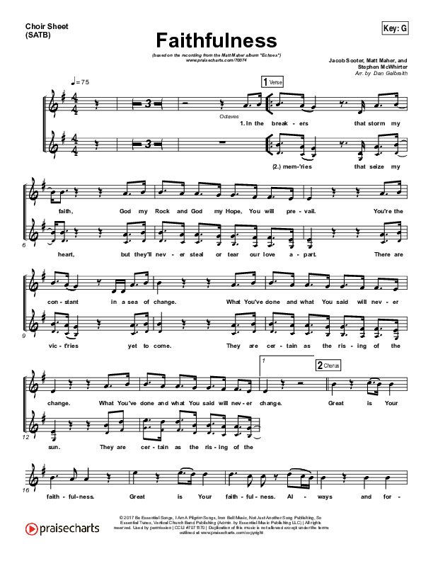 Download the Choir Sheet for Faithfulness by Matt Maher / Iron Bell Music, from the album Echoes. This song was arranged by Daniel Galbraith in the key of F, G.