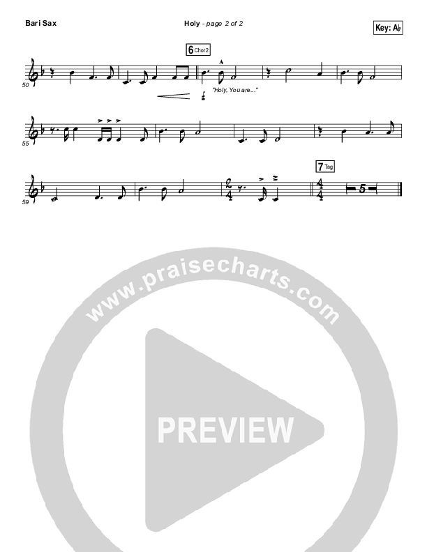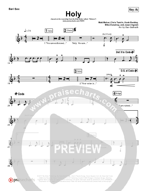 Download the Bari Sax sheet music for Holy by Matt Maher, from the album Echoes. This song was arranged by Daniel Galbraith in the key of Ab, G.