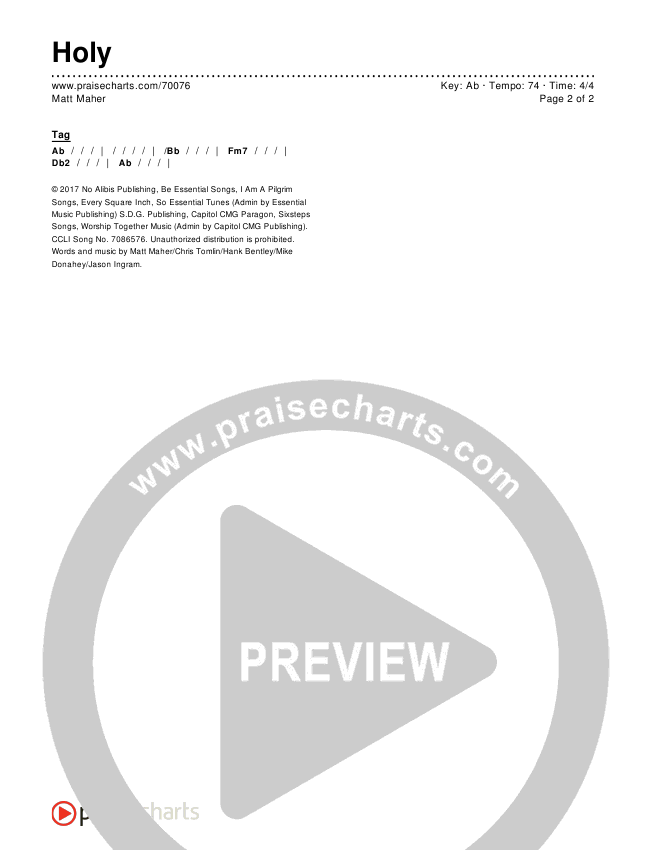 Download the PDF Chord Charts for Holy by Matt Maher, from the album Echoes. This song was arranged by Daniel Galbraith in the key of Ab, G.