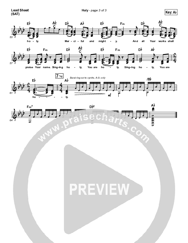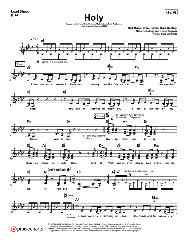 Download the sheet music for Holy by Matt Maher, from the album Echoes. This song was arranged by Daniel Galbraith in the key of Ab, G.
