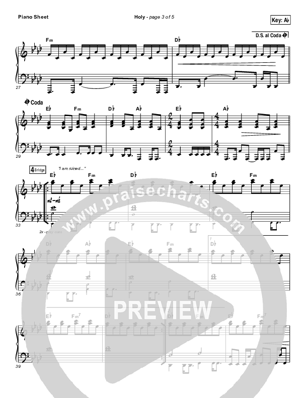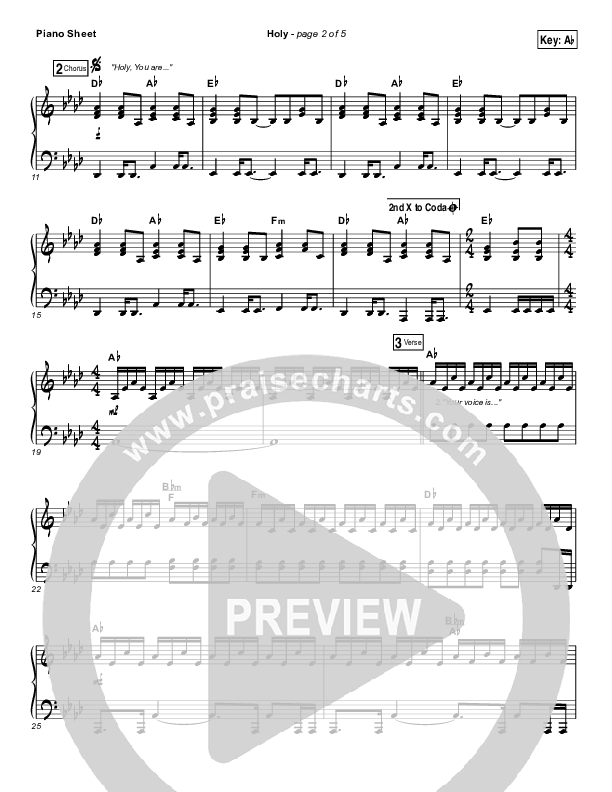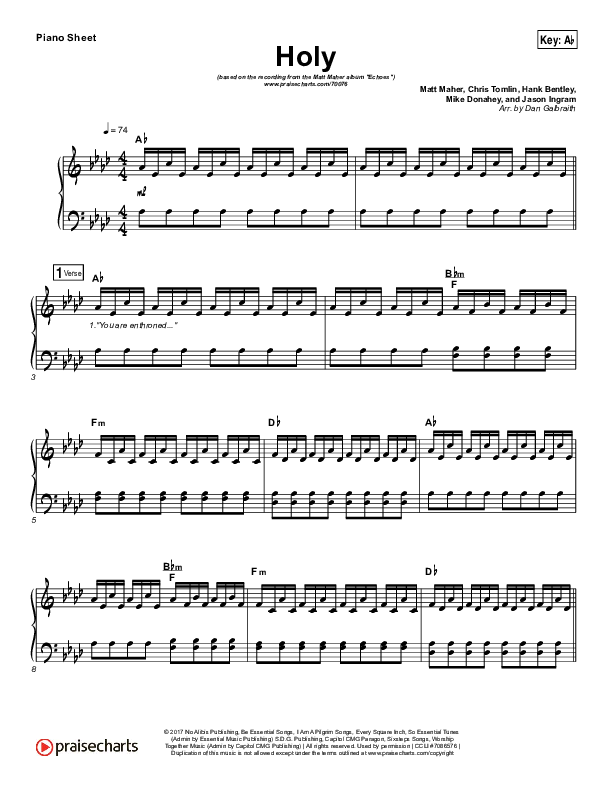 Download the piano sheet for Holy by Matt Maher, from the album Echoes. This song was arranged by Daniel Galbraith in the key of Ab, G.