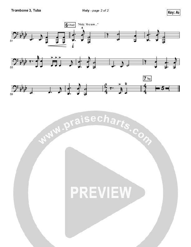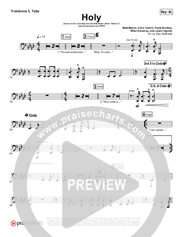 Download the Trombone 3/Tuba sheet music for Holy by Matt Maher, from the album Echoes. This song was arranged by Daniel Galbraith in the key of Ab, G.