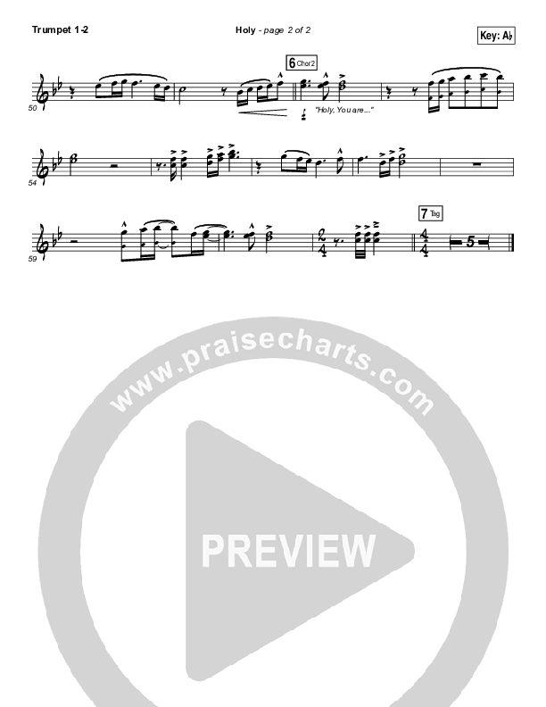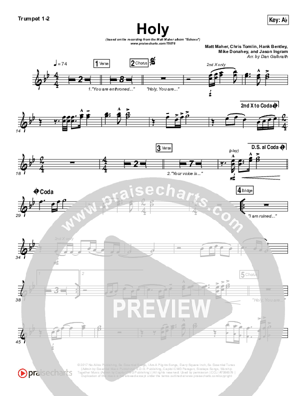 Download the trumpet sheet music for Holy by Matt Maher, from the album Echoes. This song was arranged by Daniel Galbraith in the key of Ab, G.