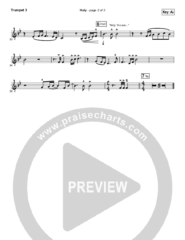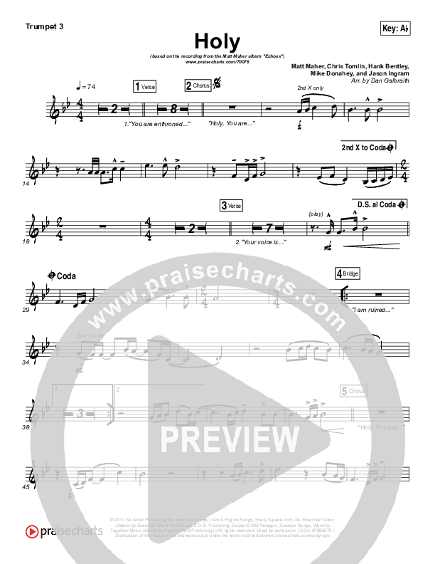 Download the Trumpet 3 sheet music for Holy by Matt Maher, from the album Echoes. This song was arranged by Daniel Galbraith in the key of Ab, G.