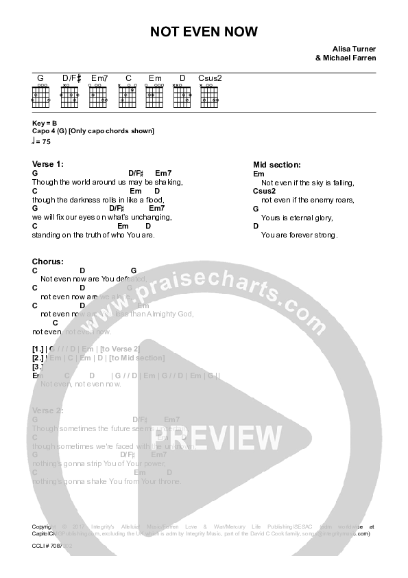 Download the PDF Chord Charts for Not Even Now by Alisa Turner, from the album Alisa Turner. This song was arranged by Integrity Music in the key of B.