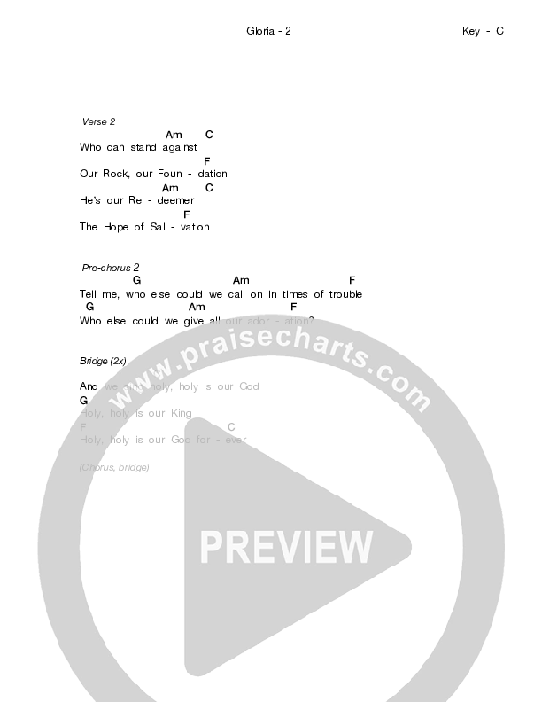 Download the PDF Chord Charts for Gloria by Stephen Christian, from the album Wildfires. This song was arranged by Word Music in the key of C, D.