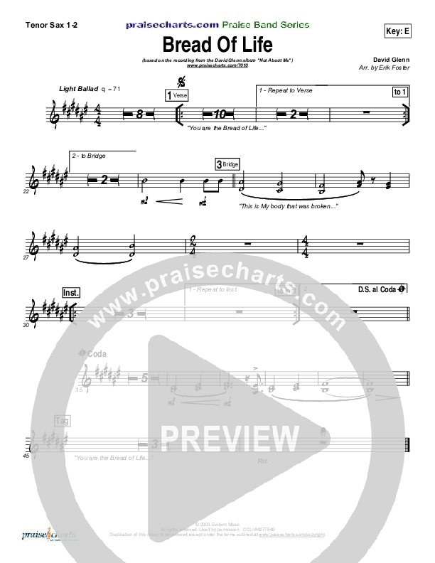 Download the Tenor Sax sheet music for Bread Of Life by David Glenn, from the album Not About Me. This song was arranged by Erik Foster in the key of E, G.