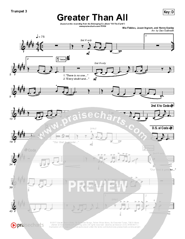 Download the Trumpet 3 sheet music for Greater Than All by The Belonging Co / Henry Seeley, from the album All The Earth. This song was arranged by Daniel Galbraith in the key of C, D.