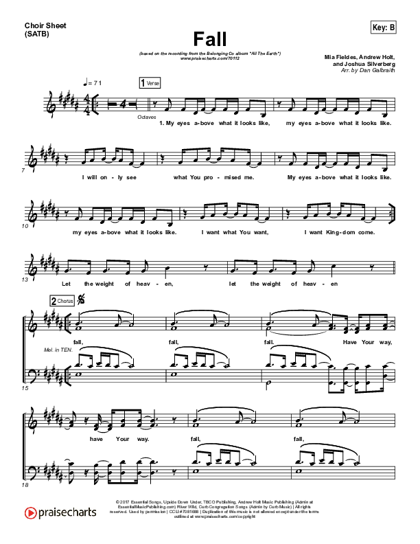 Download the Choir Sheet for Fall by The Belonging Co / Meredith Andrews / Andrew Holt, from the album All The Earth. This song was arranged by Daniel Galbraith in the key of B, Bb.