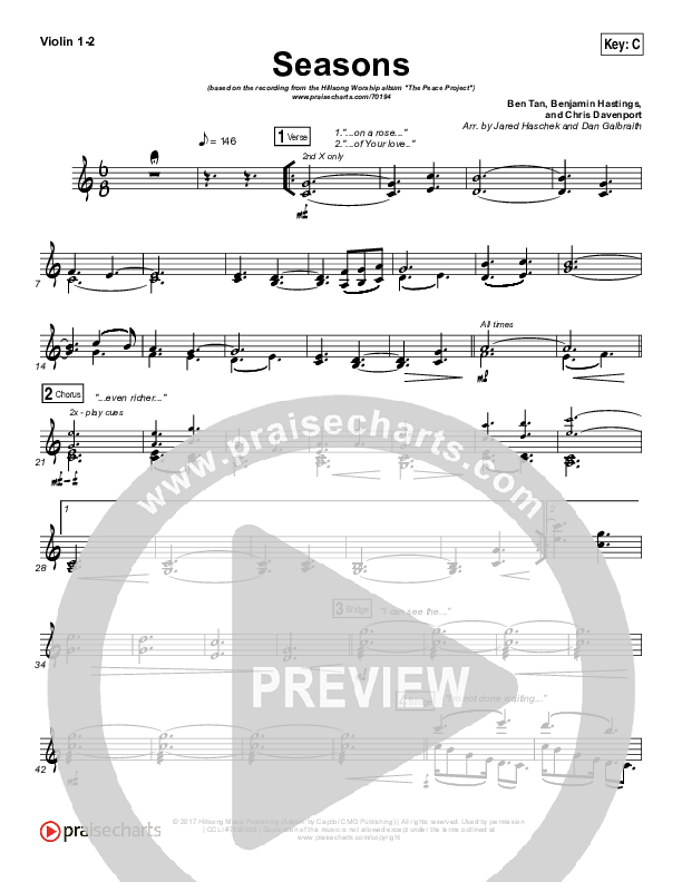 Download the Violin sheet music for Seasons by Hillsong Worship, from the album The Peace Project. This song was arranged by Jared Haschek / Daniel Galbraith in the key of C, D.