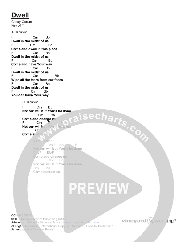 Download the PDF Chord Charts for Dwell by Vineyard Worship / Torri Baker, from the album Vineyard Soul: We Are Ready. This song was arranged by Vineyard Music in the key of F.