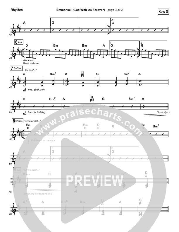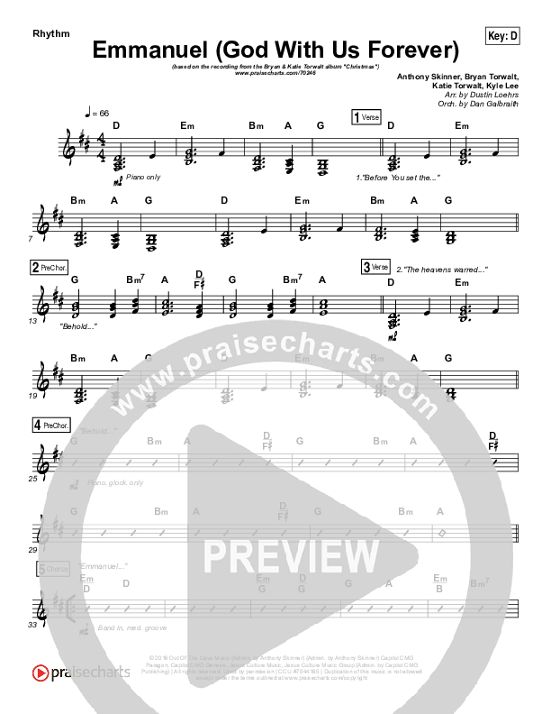 Download the Rhythm Chart for Emmanuel (God With Us Forever) by Bryan & Katie Torwalt, from the album Christmas. This song was arranged by Dustin Loehrs / Daniel Galbraith in the key of D, Eb.