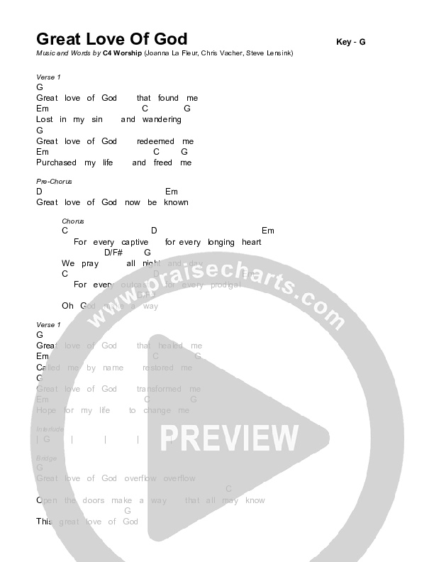 Download the PDF Chord Charts for Great Love Of God by C4 Worship, from the album Hallelujah.