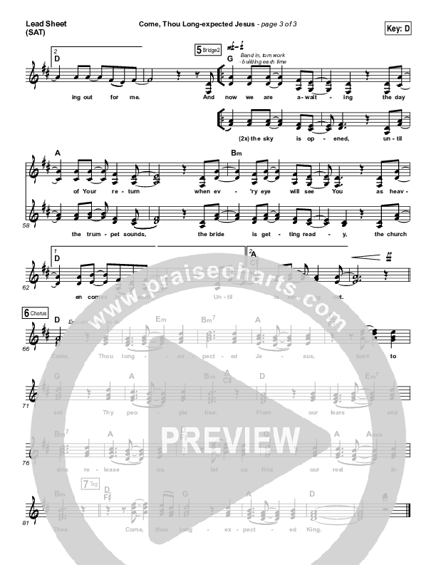 Download the sheet music for Come Thou Long Expected Jesus by Meredith Andrews, from the album Receive Our King. This song was arranged by Daniel Galbraith in the key of C, D.