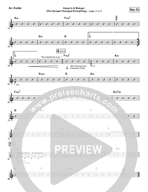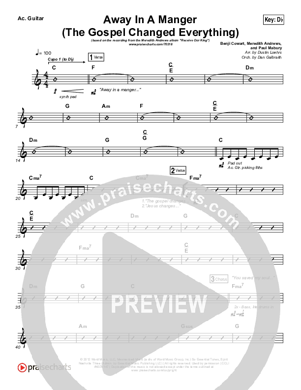 Download the Acoustic Guitar sheet music for Away In A Manger (The Gospel Changes Everything) by Meredith Andrews / Maverick Sooter, from the album Receive Our King. This song was arranged by Dustin Loehrs / Daniel Galbraith in the key of D, Db.