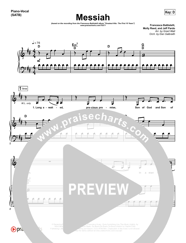 Download the sheet music for Messiah by Francesca Battistelli, from the album This Christmas. This song was arranged by Grant Wall / Daniel Galbraith in the key of D, Eb.