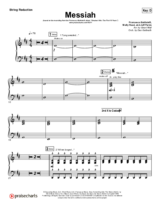 Download the Orchestration for Messiah by Francesca Battistelli, from the album This Christmas. This song was arranged by Grant Wall / Daniel Galbraith in the key of D, Eb.
