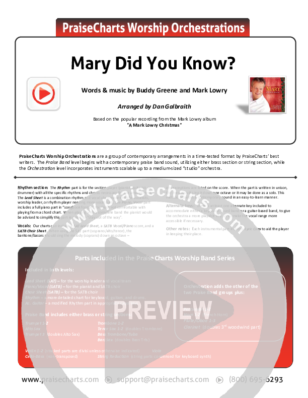Download the Orchestration for Mary Did You Know by Mark Lowry, from the album A Mark Lowry Christmas. This song was arranged by Daniel Galbraith in the key of Bm, Cm.