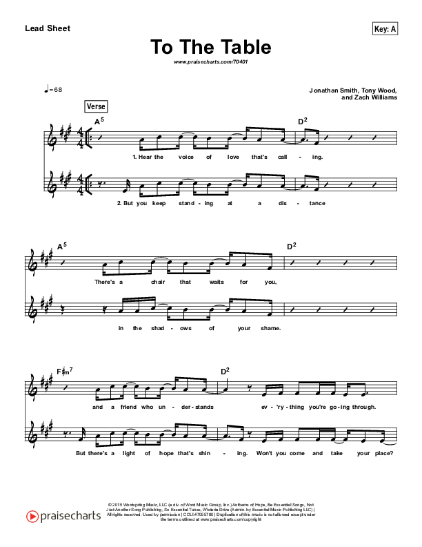Download the sheet music for To The Table (Simplified) by Zach Williams, from the album Simplified Worship. This song was arranged by Dave Iula in the key of A, Ab, E, F, G, Gb.