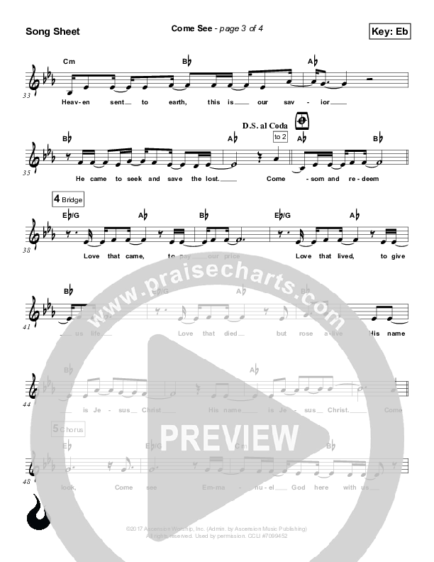 Download the sheet music for Come See by Ascension Worship, from the album Songs Of Ascension Worship. This song was arranged by Ascension Worship in the key of Eb.