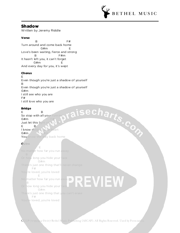 Download the PDF Chord Charts for Shadow by Jeremy Riddle, from the album More. This song was arranged by Bethel Music in the key of .