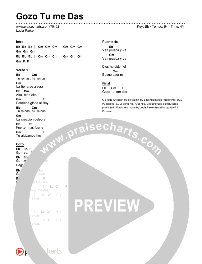 Download the PDF Chord Charts for Gozo Tu Me Das by Lucia Parker, from the album Revive (Spanish Version). This song was arranged by Bridge Music in the key of Bb.