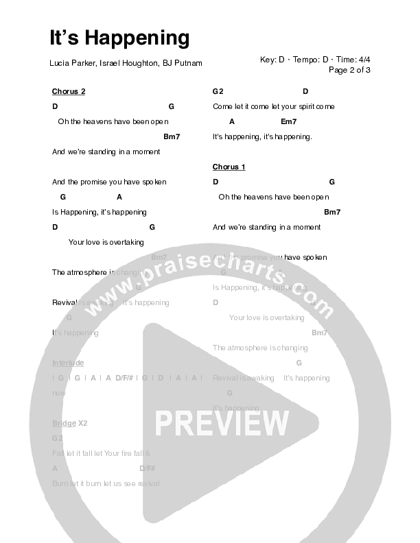 Download the PDF Chord Charts for It's Happening by Lucia Parker / BJ Putnam, from the album Revive. This song was arranged by Bridge Music in the key of D.