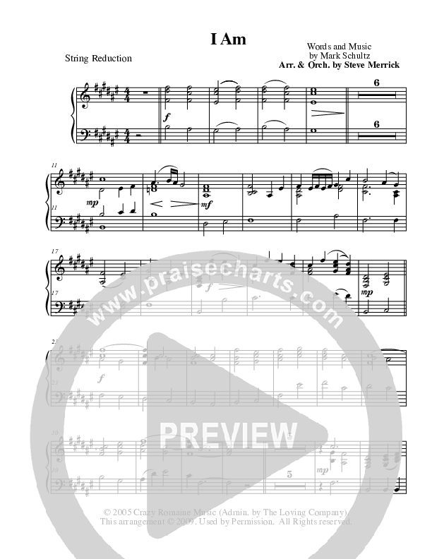 Download the Orchestration for I Am by Mark Schultz, from the album Live: A Night Of Stories And Songs. This song was arranged by Stephen Merrick in the key of F#.