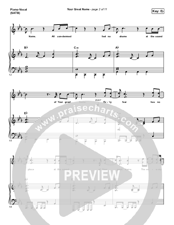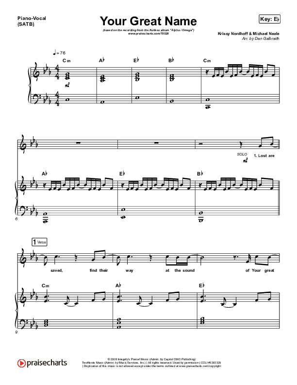 Download the sheet music for Your Great Name by Kutless, from the album Alpha / Omega. This song was arranged by Daniel Galbraith in the key of D, Eb.
