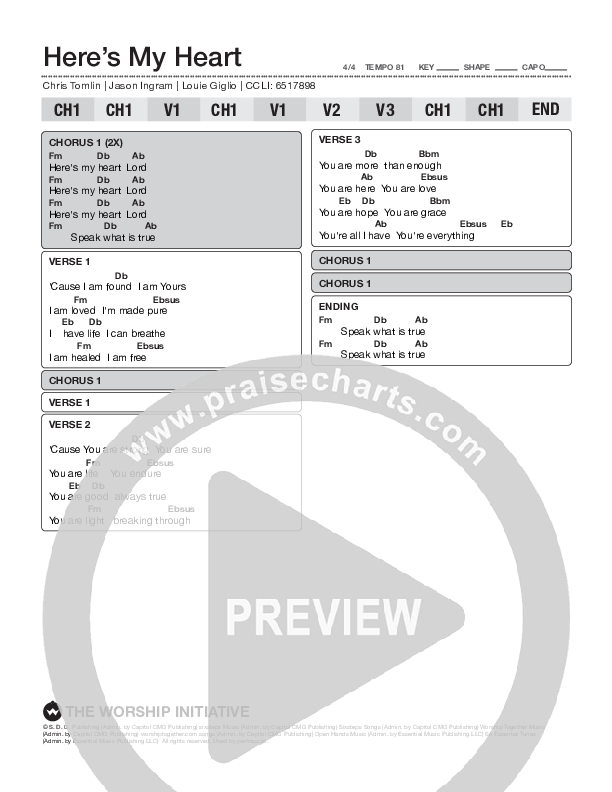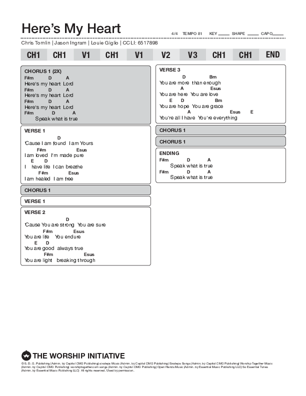 Download the PDF Chord Charts for Here's My Heart by Shane & Shane / The Worship Initiative, from the album The Worship Initiative Volume 14. This song was arranged by WI Charts in the key of A,Ab,B,Bb,C,D,Db,E,Eb,F,G,Gb.