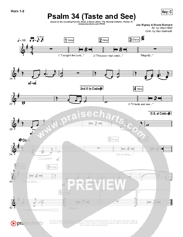 Download the French Horn sheet music for Psalm 34 (Taste and See) by Shane & Shane / The Worship Initiative, from the album Psalms 2. This song was arranged by Grant Wall / Daniel Galbraith in the key of C, D.