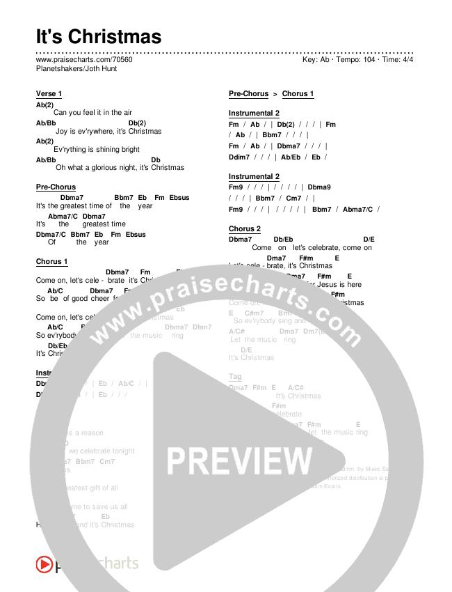 Download the PDF Chord Charts for It's Christmas by Planetshakers / Joth Hunt, from the album Planetshakers Christmas Volume 1. This song was arranged by Jared Haschek in the key of A, Ab.