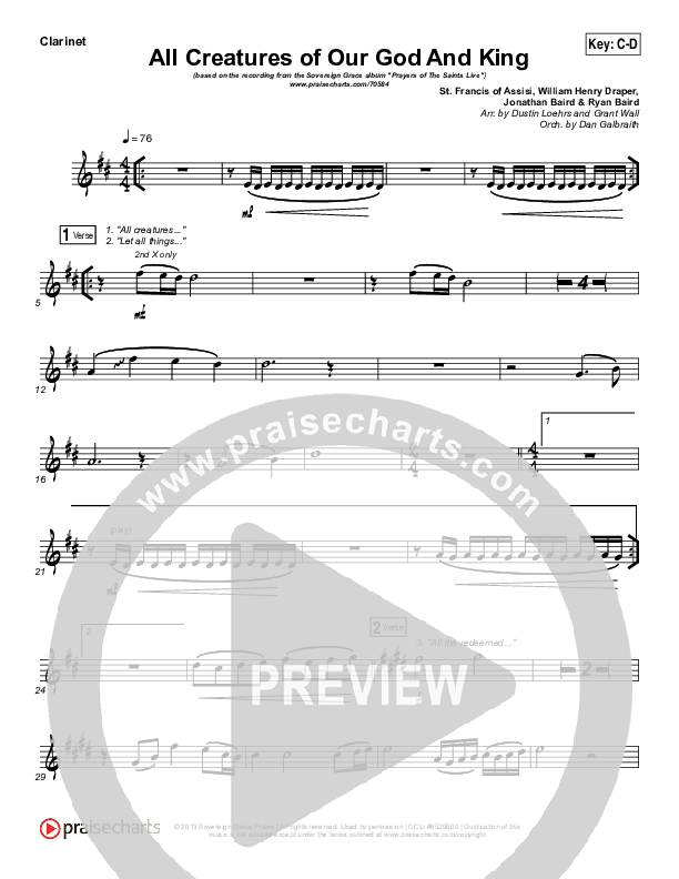 Download the Orchestration for All Creatures Of Our God And King by Sovereign Grace, from the album Prayers Of The Saints Live. This song was arranged by Dustin Loehrs / Daniel Galbraith in the key of C, Db.