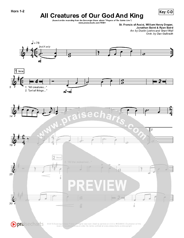 Download the French Horn sheet music for All Creatures Of Our God And King by Sovereign Grace, from the album Prayers Of The Saints Live. This song was arranged by Dustin Loehrs / Daniel Galbraith in the key of C, Db.