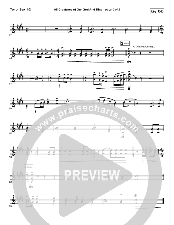 Download the Tenor Sax sheet music for All Creatures Of Our God And King by Sovereign Grace, from the album Prayers Of The Saints Live. This song was arranged by Dustin Loehrs / Daniel Galbraith in the key of C, Db.
