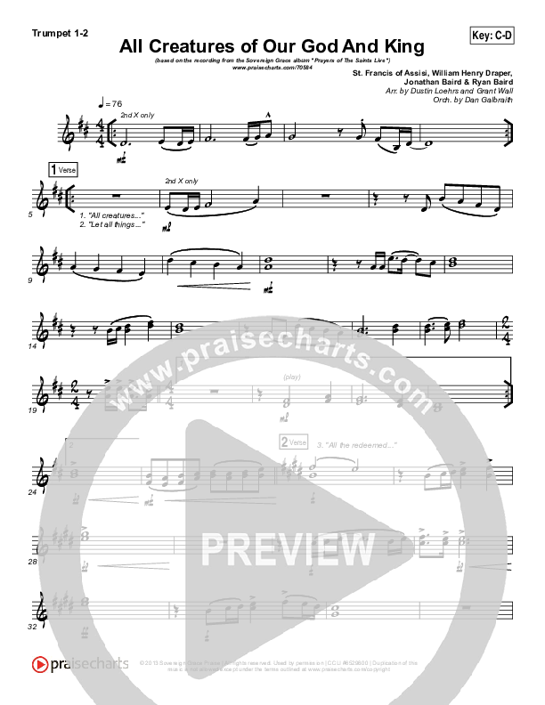 Download the trumpet sheet music for All Creatures Of Our God And King by Sovereign Grace, from the album Prayers Of The Saints Live. This song was arranged by Dustin Loehrs / Daniel Galbraith in the key of C, Db.