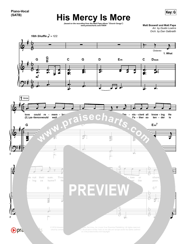 Download the sheet music for His Mercy Is More by Matt Papa, from the album Church Songs. This song was arranged by Dustin Loehrs / Daniel Galbraith in the key of F, G.