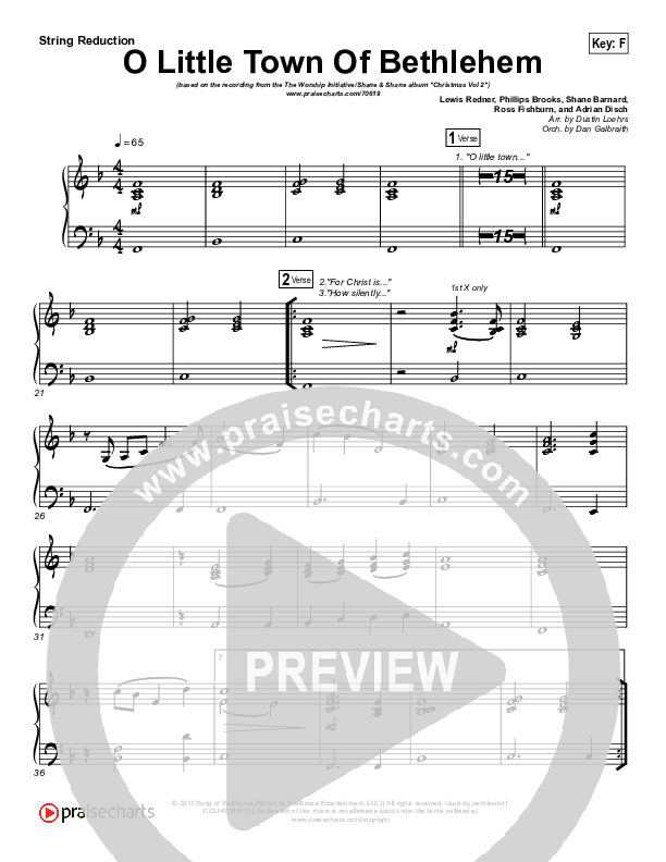 Download the Orchestration for O Little Town Of Bethlehem by The Worship Initiative / Shane & Shane, from the album A Worship Initiative Christmas Volume 2. This song was arranged by Dustin Loehrs / Daniel Galbraith in the key of E, F.