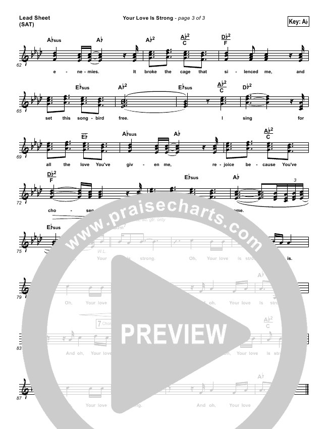 Download the sheet music for Your Love Is Strong by Cory Asbury, from the album Reckless Love. This song was arranged by Grant Wall in the key of Ab, G.