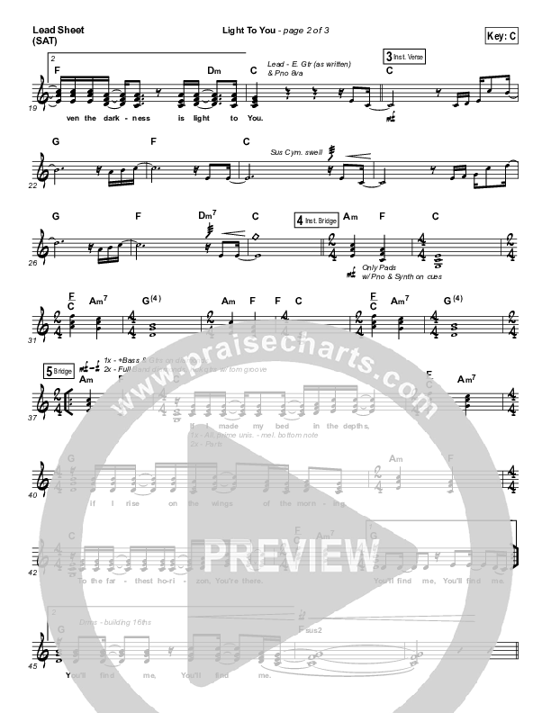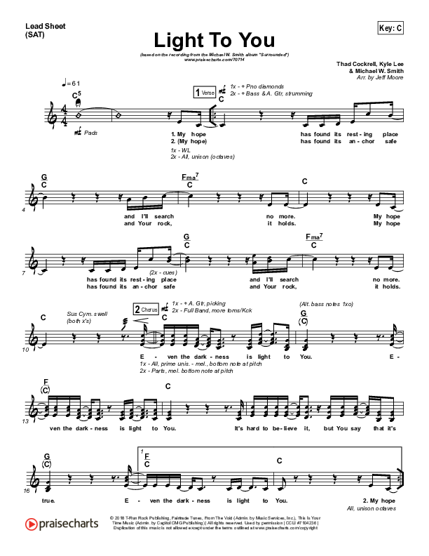 Download the sheet music for Light To You by Michael W. Smith, from the album Surrounded. This song was arranged by Jeff Moore in the key of C, G.