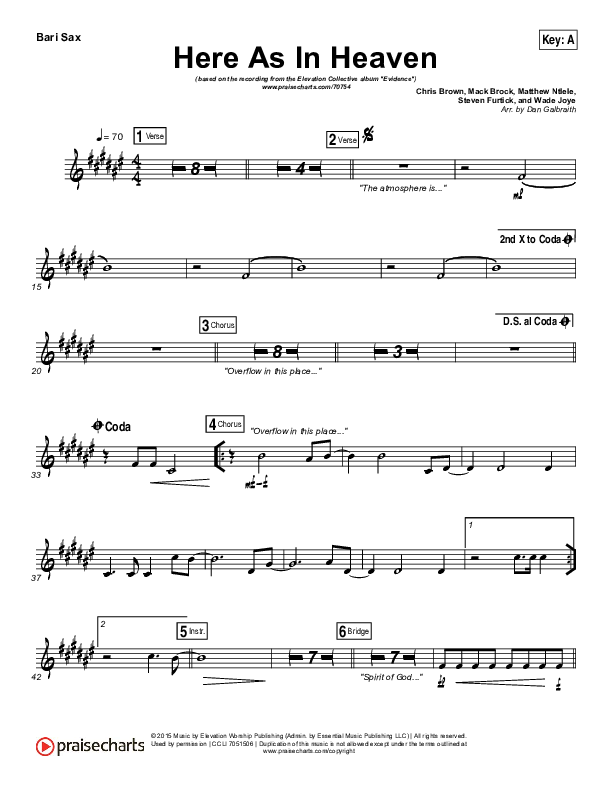 Download the Bari Sax sheet music for Here As In Heaven by Elevation Collective / Tasha Cobbs Leonard, from the album Evidence. This song was arranged by Daniel Galbraith in the key of A, Bb.