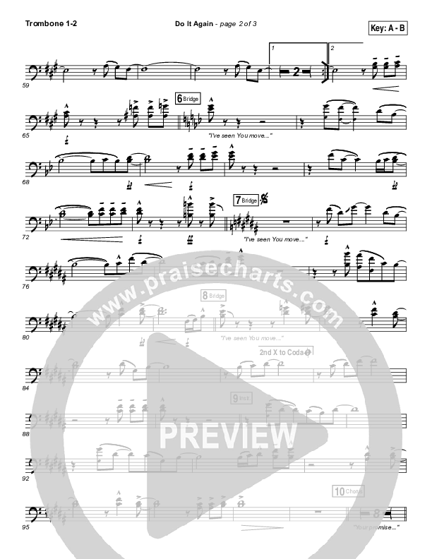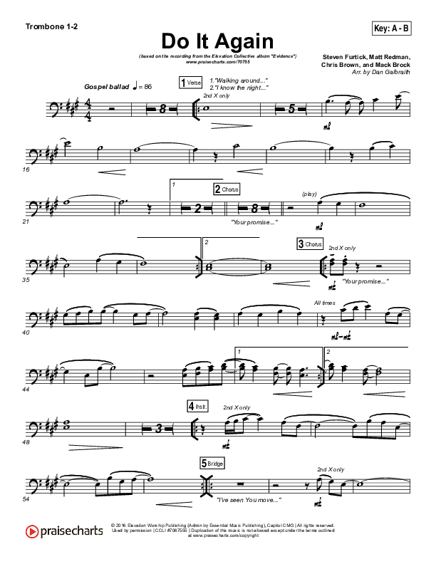 Download the Trombone 1,2 sheet music for Do It Again by Elevation Collective / Travis Greene / Kierra Sheard, from the album Evidence. This song was arranged by Daniel Galbraith in the key of A, Bb.