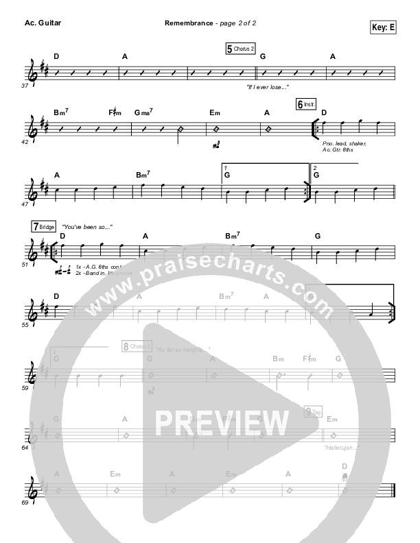 Download the Acoustic Guitar sheet music for Remembrance (Live Acoustic) by Hillsong Worship, from the album There Is More. This song was arranged by Dave Iula / Daniel Galbraith in the key of E, F.