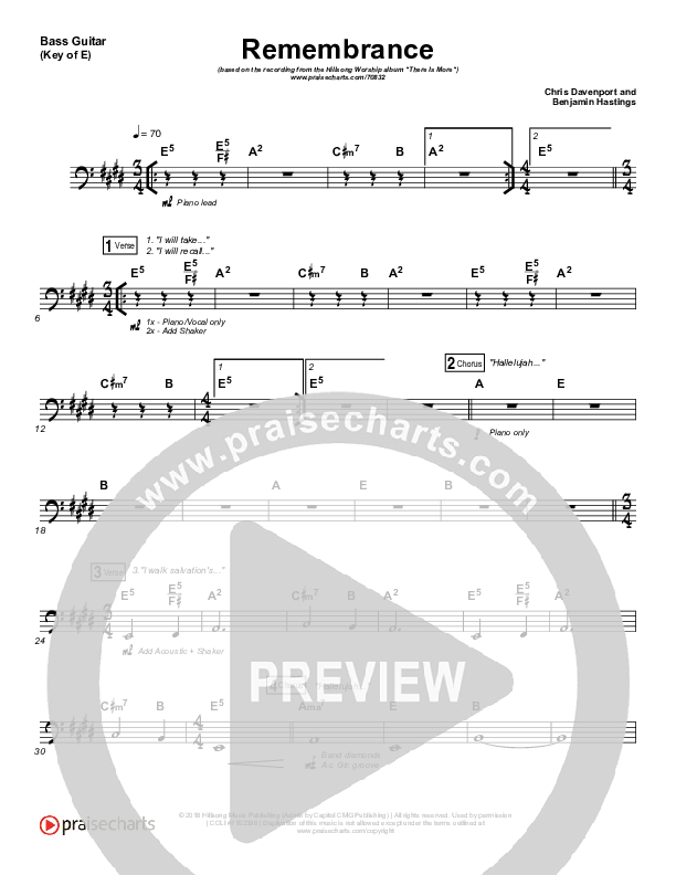 Download the Bass Guitar parts for Remembrance (Live Acoustic) by Hillsong Worship, from the album There Is More. This song was arranged by Dave Iula / Daniel Galbraith in the key of E, F.
