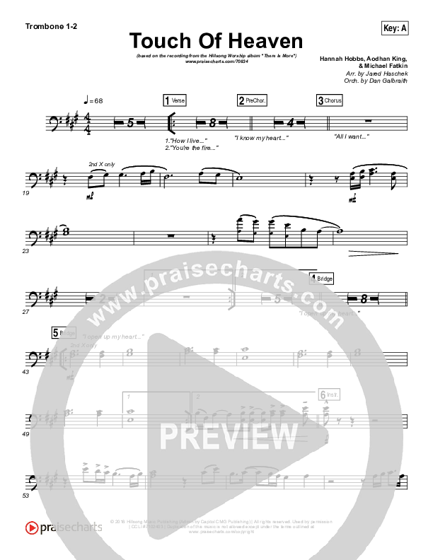 Download the Trombone 1,2 sheet music for Touch Of Heaven by Hillsong Worship, from the album There Is More. This song was arranged by Jared Haschek / Daniel Galbraith in the key of A, G.