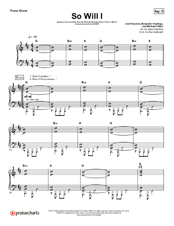 Download the piano sheet for So Will I (100 Billion X) (Live) by Hillsong Worship, from the album There Is More. This song was arranged by Jared Haschek / Daniel Galbraith in the key of Bb, C, D, Db, E, Eb, F.