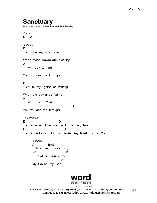 Download the PDF Chord Charts for Sanctuary by Zealand, from the album Liberated. This song was arranged by Word Music in the key of A, G.