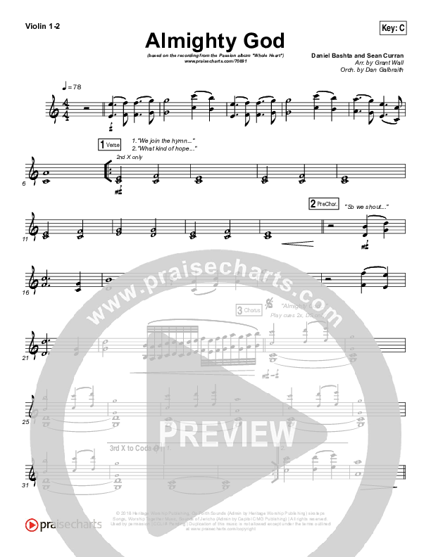 Download the Violin sheet music for Almighty God by Passion / Sean Curran, from the album Whole Heart. This song was arranged by Grant Wall / Daniel Galbraith in the key of Bb, C.