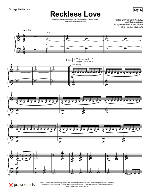 Download the Orchestration for Reckless Love by Passion / Melodie Malone, from the album Whole Heart. This song was arranged by Grant Wall / Jeff Moore / Daniel Galbraith in the key of C, D.