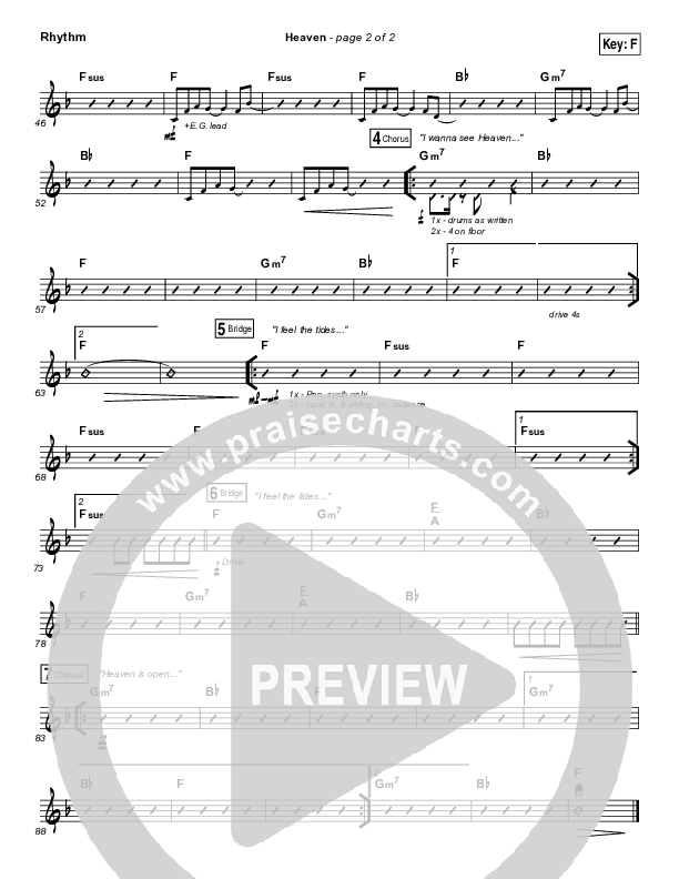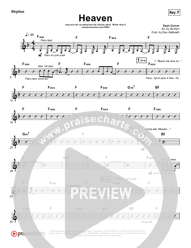Download the Rhythm Chart for Heaven by Passion / Sean Curran, from the album Whole Heart. This song was arranged by Ed Kerr / Daniel Galbraith in the key of F, G.